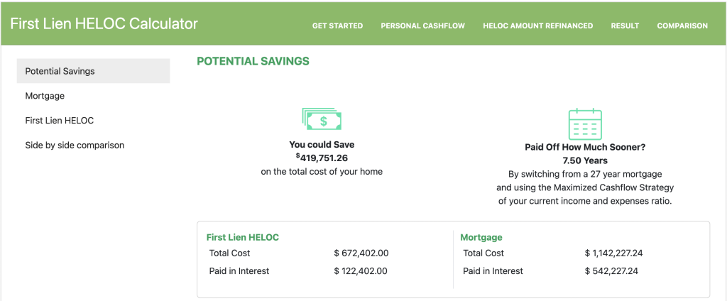 Whether you’re considering a First Lien HELOC for home equity optimization or comparing mortgage options through mortgage comparison, the Savings Calculator is your key to unlocking actionable financial insights.